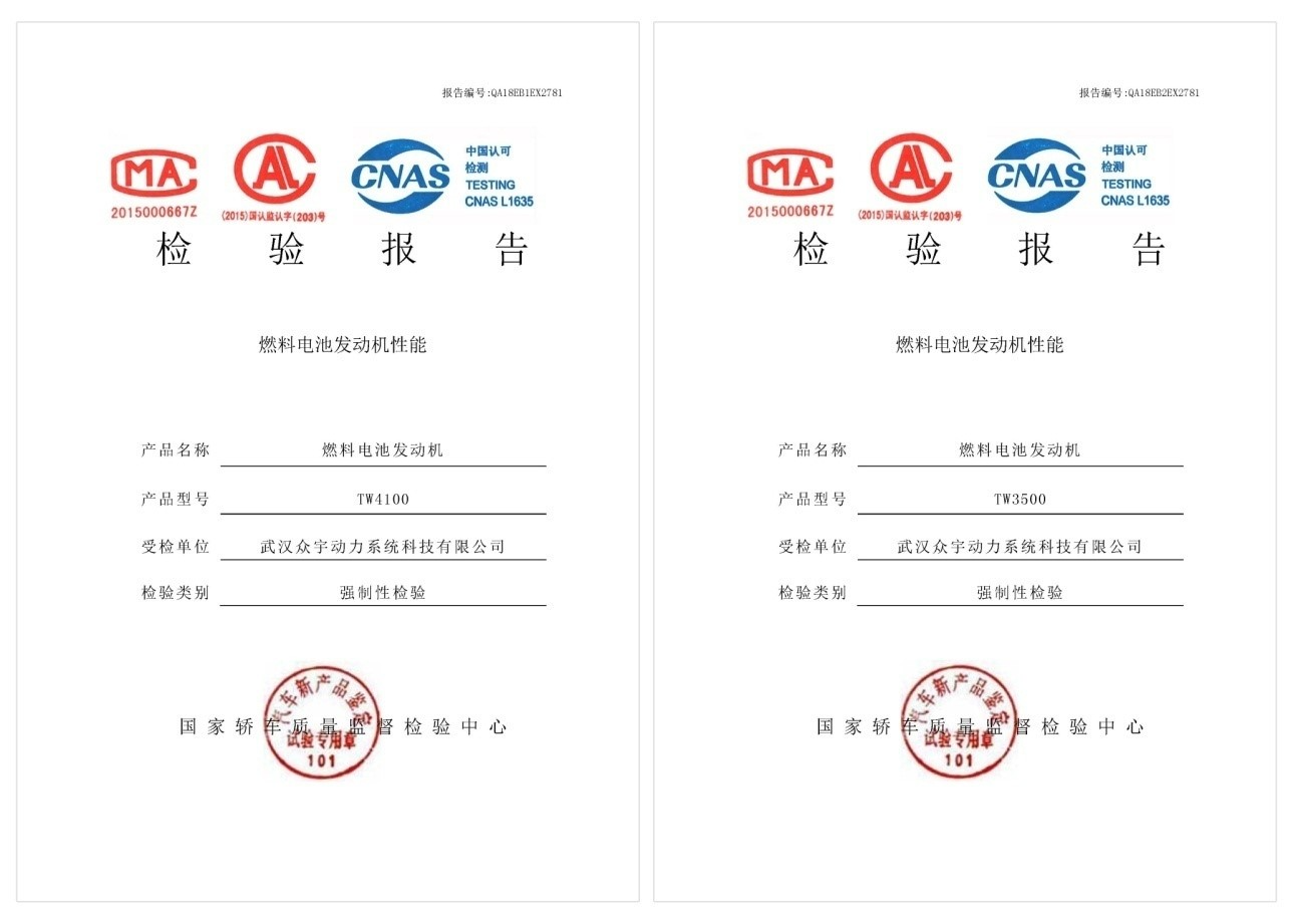 2018年5月,众宇动力的两款功率分别为35kW和41kW的氢燃料电池车用动力系统通过了国家轿车质量监督检验中心(天津汽车检测中心)燃料电池发动机性能强制性检验,并在全国范围内第一个通过了零下40度到零上60度的高低温存储补贴项试验。