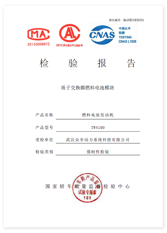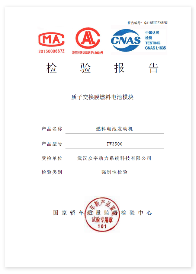 2018年6月6日,众宇动力收到了国家轿车质量监督检验中心(天津汽车检测中心)核发的两款功率分别为35kW和41kW的车用氢燃料电池发动机的高低温存储强制性检验报告,这标志该两款发动机已满足2018年燃料电池汽车的最新补贴政策。