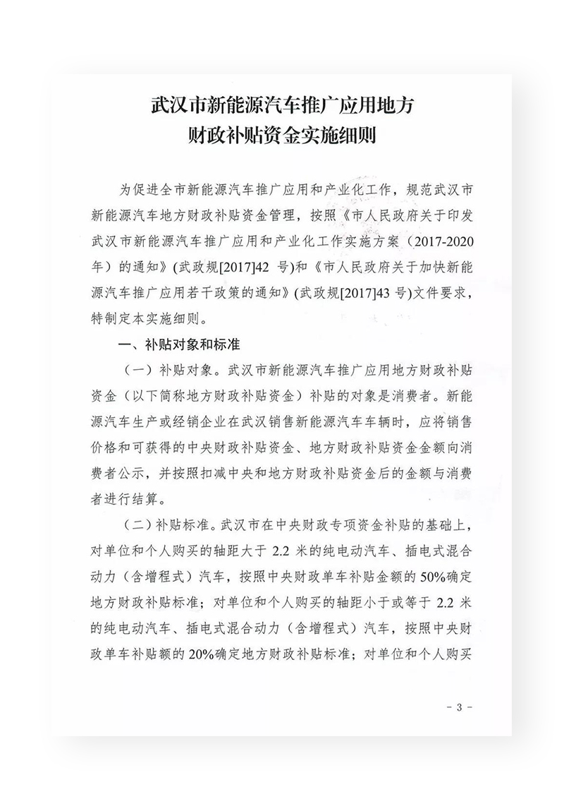 近日,武汉市经信委、财政局、科技局、发改委联合下发了《武汉市新能源汽车推广应用地方财政补贴资金实施细则》。细则对2018-2020年武汉市新能源汽车推广应用地方补贴细则进行了明确,明确了补贴对象为消费者,并以轴距为主要参考依据给出了地方补贴标准。