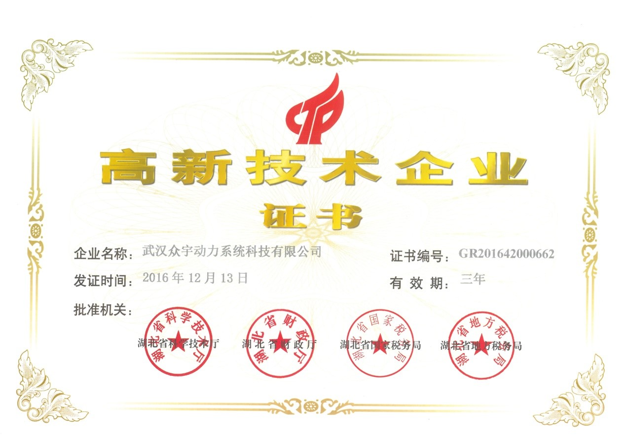 2月24日,武汉众宇动力系统科技有限公司荣获由湖北省科学技术厅、湖北省财政厅、湖北省国家税务局及湖北省地方税务局联合颁发的“高新技术企业”认定证书,证书的颁发标志着众宇动力的技术研发水平得到了进一步提升。