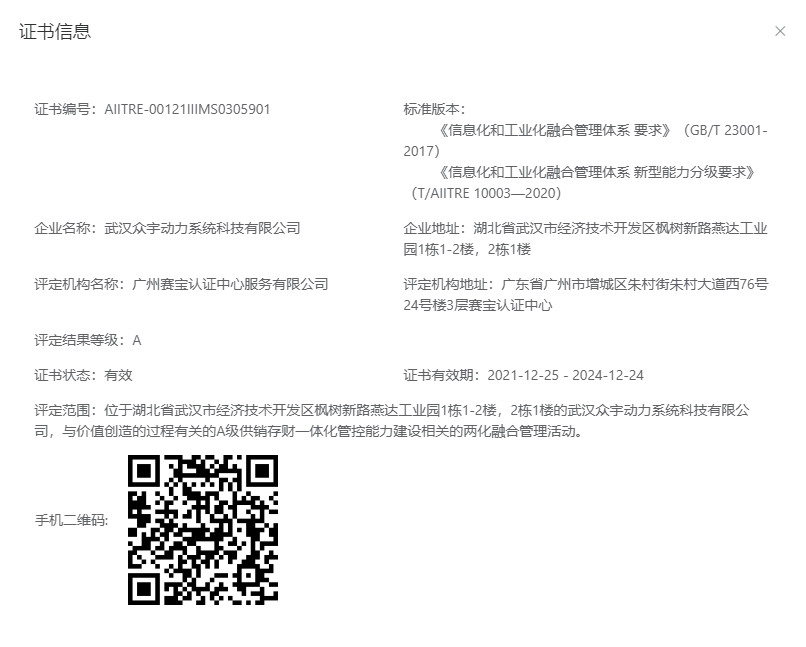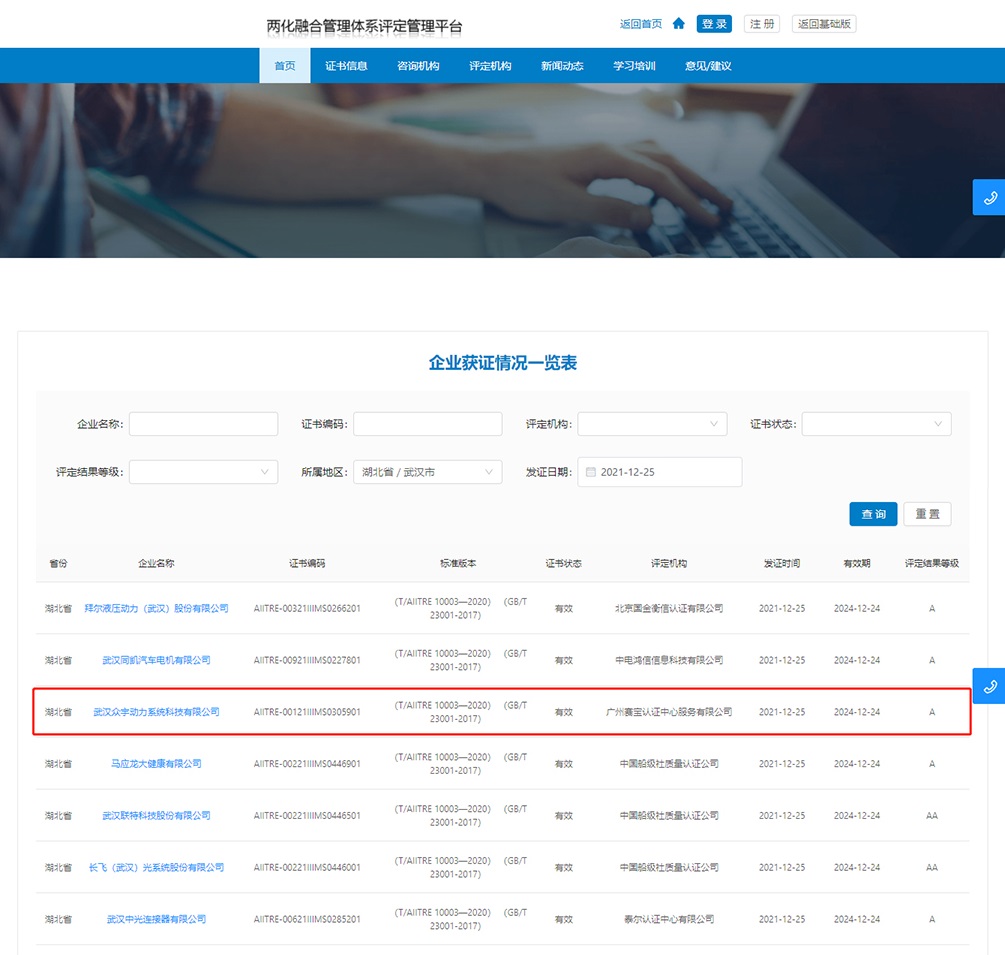 12月25日,武汉众宇动力系统科技有限公司(下称众宇)顺利通过《信息化和工业化融合管理体系要求》(GB/T23001-2017)体系认证,被授予两化融合管理体系评定证书,这标志着众宇在推进信息化和工业化深度融合方面进入了新阶段,继知识产权管理、环境管理等体系获认证后,公司实力再获国家级认可。