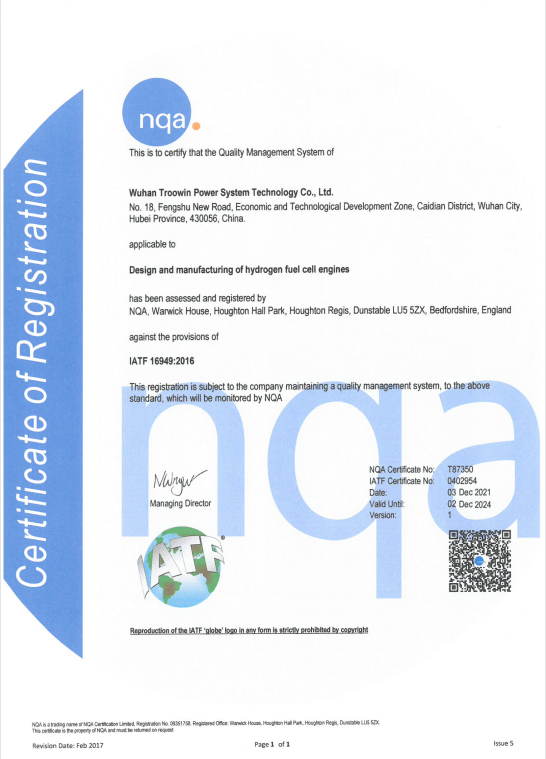 成立10年以来,作为燃料电池专家,众宇已全面掌握了氢燃料电池的核心技术,在电堆设计与开发、核心零部件研发与国产化、控制策略开发等方面保持领先优势,并建成了先进的电堆及系统批量化产线。此次IATF16949认证的通过标志众宇产品质量管控工作迈入更新、更高的水平阶段,接下来,众宇将严格按照体系标准规范研发、生产及服务过程,为公司持续高质量创新发展打好基础,推进燃料电池产业自主化、市场化、规模化,助推国家能源转型及双碳目标达成。