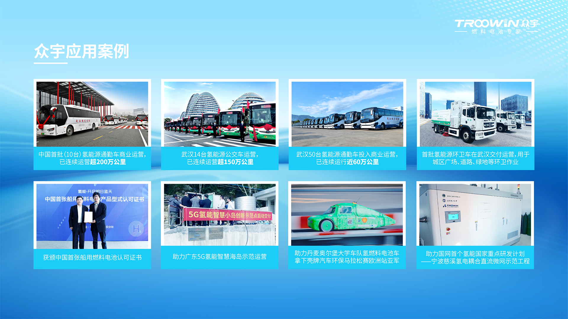 众宇TWLQ系列车用燃料电池系统基于G4电堆开发,功率可覆盖30-240kW,具有适配性强、效率高、可靠性强、超环保、超安全等特点,适用于各类城市公交/客车、轻//重型载货/物流车、牵引车、专用车等,目前已在东风、金龙、开沃等国内主流车厂近20款车型上搭载并进入工信部推进目录,并在武汉公交、通勤、环卫、物流等领域近百台车上搭载、投入运营,连续稳定运行超500万公里,接下来还将在包括武汉在内的全国多个城市近千台车上搭载、推广运行。