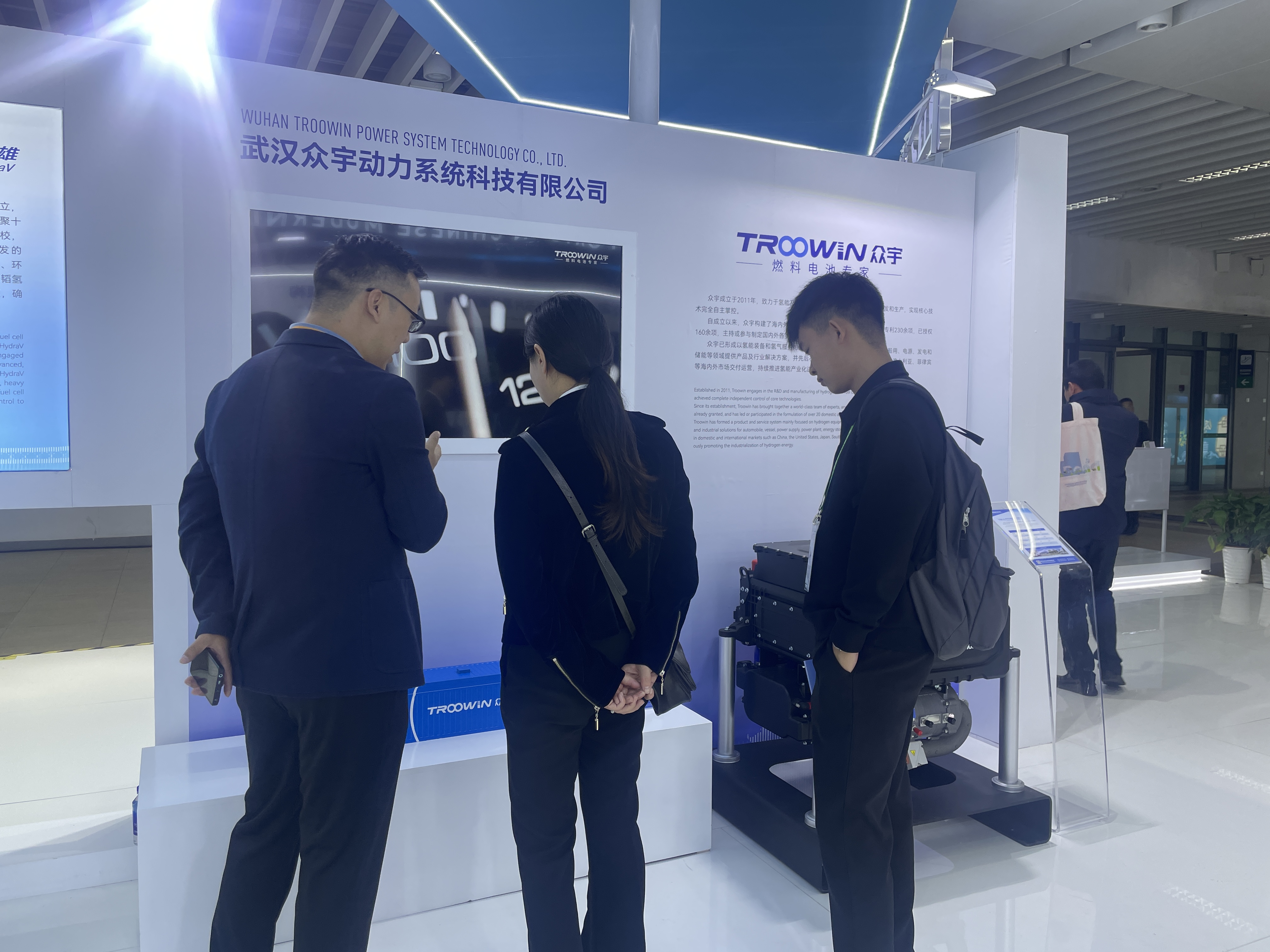 作为湖北氢能产业代表企业,众宇受邀亮相“湖北综合形象区”,面向全球展示中国、湖北氢能产业发展新成果。在进博会现场,众宇带来了车用燃料电池系统和燃料电池发电站,同时展示了众宇在氢能领域多场景应用产品及实践探索方面的成果,受到了来自全球各地的行业客户、展商及机构的热烈关注。